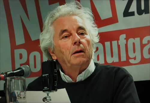 2 Hartmut Wächtler spricht am 3. Mai 2018 im „EineWelthaus“ über das Polizeiaufgabengesetz, das nichts anderes sei als Ausfluss von Angst und Kontrollwahn. Foto: Jessica di Rovereto