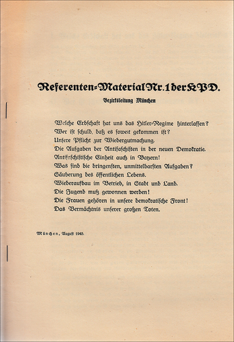 Im August heißt es: „Aktionsgemeinschaft der sozialdemokratischen und der kommunistischen Partei in München … Keine Wiederholung der Fehler von 1918! Schluss mit der Spaltung des arbeitenden Volkes! Keinerlei Nachsicht gegenüber dem Nazismus und der Reaktion! Schaffung der festen Einheit der Demokratie für die Ausrottung des Faschismus mit der Wurzel und zum Aufbau eines neuen, wahrhaft freien demokratischen Deutschlands!“2