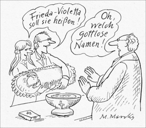 Autorinnen und Autoren sind manchmal froh, wenn sie von der Lektorin oder dem Lektor auf Unverständliches oder Widersprüchliches hingewiesen werden. Es kann auch geschehen, dass die Autorin nach der Drucklegung ihren Text ohne Absprache verändert vorfindet, dann gibts Ärger. Das kann sogar Karikaturistinnen treffen. Selbstverständlich haben die Medien das Recht, Texte oder Bilder auch ohne Begründung abzulehnen, aber … Anlässlich des Evangelischen Kirchentags im Juni bietet Marie Marcks der Süddeutschen Zeitung diese Karikatur an: