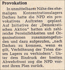 „In der Hoffnung, er könnte mit den NPD-Leuten diskutieren, suchte am 19. Juli der Münchner Medizinstudent Karl E. (22) eine Versammlung der Nationaldemokraten auf. Doch das einzig schlagende Argument, das er an diesem Abend wahrnahm, verspürte er in seinem Bauch. Dort traf ihn der Schlag des Münchner NPD-Vorsitzenden Gerhard M. (29).“9
