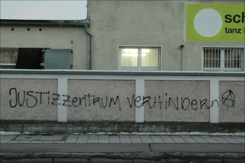 In der Nacht vom 31. Oktober auf den 1. November fliegen in der Tizianstraße 50 Steine auf das Büro von Behringer Ingenieure, Gutachter bei der Ausschreibung für den Bau des neuen Justiz-