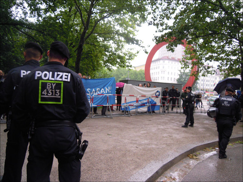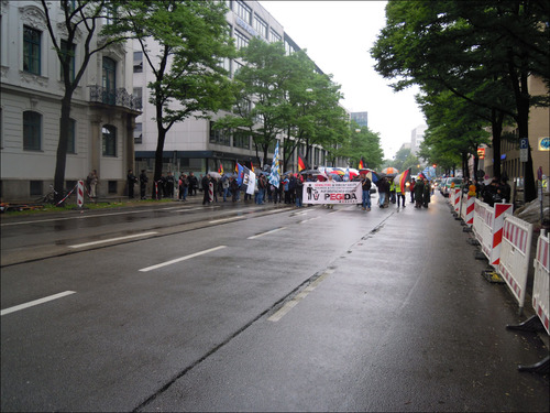 Um die 100 zumindest wasserdichte Pegida-München-Fans treffen sich am 15. Juni am Stiglmaierplatz im Regen. Wegen vieler interner Querelen heißt „Bagida“ seit einigen Wochen „Pegida München“. Siehe www.pi-news.net/2015/04/bagida-heisst-jetzt-pegida-muenchen/