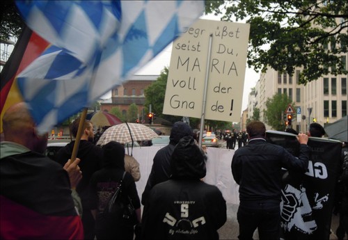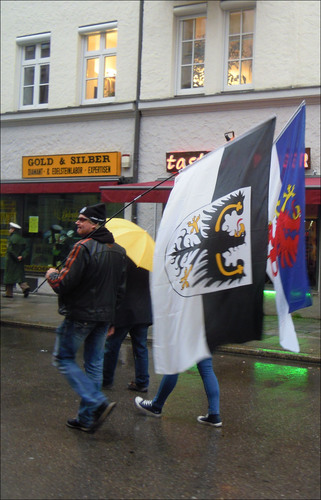Eloquente Redner*innen findet die Pegida-München-Organisatorin Birgit Weißmann immer wieder. Der heutige Redner soll acht Sprachen sprechen, u.a. Japanisch. Er schwärmt sogleich von Japans Patriotismus. Er spricht von den „afrikanischen Massen“, für die die UNO Menschenrechte „erfindet“. Es geht um die Selbstbestimmung von Eltern, die über die Anzahl ihrer Kinder frei ent-