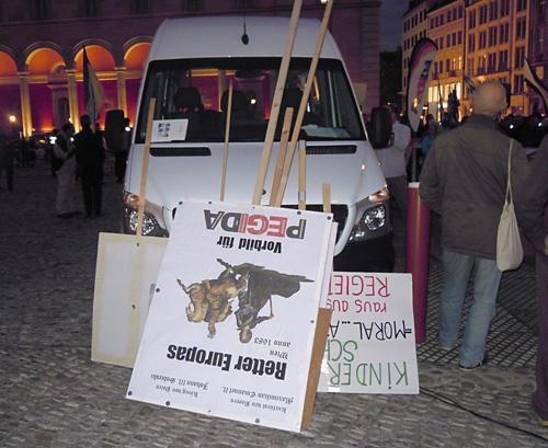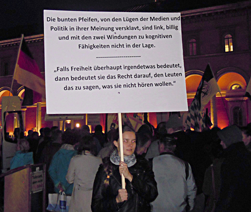 Von (politisch) linker nach (politisch) rechter Seite wird einem dort stehenden dunkelhäutigeren Mann zugerufen „Da ist einer Mulatte und steht auf der falschen Seite“. Negativ-Krönungen der linksorientierten „Protestkultur“ sind Sätze wie „Halt die Fresse!“ in Dauerschleife und „Ihr seid so scheiße!“. Die übererregten Hasstiraden wirken wie dumpfe Triebabfuhr. Pegida scheint als Pro-