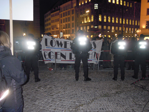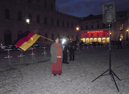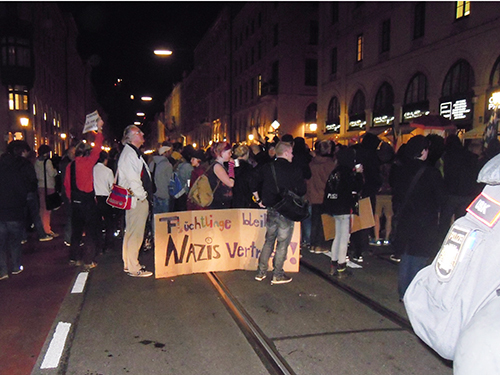 von der Polizei nicht gelassen. Am Thomas Wimmer-Ring ist Schluss und der Rückweg zum Max-Joseph-Platz von der Gegendemo verstellt. Unter Polizeibegleitung werden die Pegidas an den Gegendemonstrant*innen über den Gehweg rechter Hand abgeleitet.