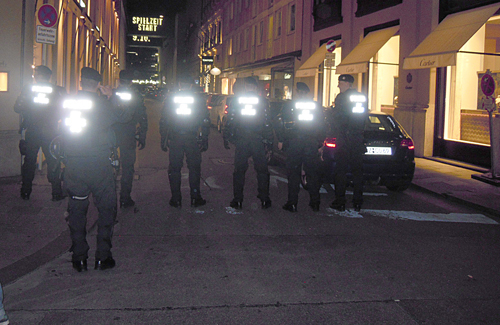 Die Polizei verstellt die Seitenstraßen der Maximilianstraße, um den Gegendemonstrant*innen den Weg zu versperren.