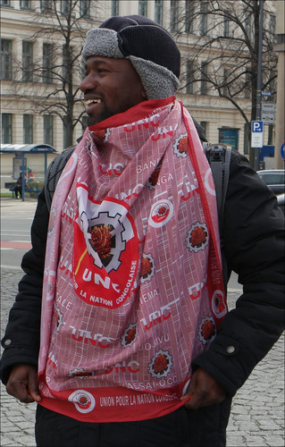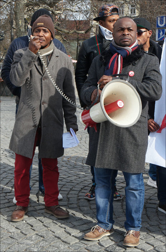 Mir fällt auf: Es geht um ein sehr ernstes Thema. Diktatur und Terror im eigenen Land am Kongo. Außerdem ist es eiskalt. Einige wenige Deutsche hasten vorbei, um Einkäufe zu tätigen. Nur ein Punker bleibt stehen und sieht und hört interessiert zu. Und dennoch greift die Negation der Nega-