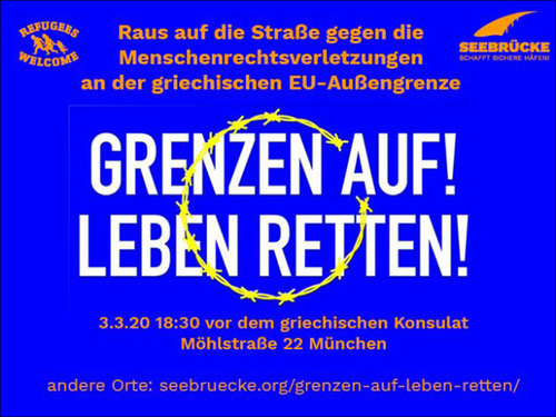Die Seebrücke, der Bayerische Flüchtlingsrat, der Münchner Flüchtlingsrat und #NoPag fordern die sofortige Evakuierung der Lager, ein sofortiges Ende der Gewalt an der griechisch-türkischen Grenze sowie die Aufnahme der Menschen in Deutschland und Europa und Bewegungsfreiheit für die Menschen: „WIR HABEN PLATZ!“ Über 100 Menschen protestieren am Dienstag, 3. März, vor dem Griechischen Generalkonsulat in der Möhlstraße 22 in Bogenhausen.