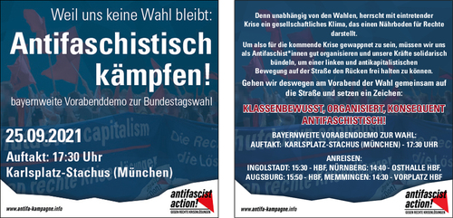 stellung selbst verbrannt. Ihnen stehen etwa 200 Gegendemonstrantinnen und -demonstranten gegenüber. Im Bereich der Residenzstraße und Perusastraße versuchen diese den Zugang zur Versammlung zu behindern. Polizei droht hier etwa zwanzigmal an, den Schlagstock einzusetzen, dreimal schlagen Beamte zu und schieben und drücken die Gegendemonstranten zur Seite. Beim Ende der Versammlung schieben und drücken sie ebenfalls, um gegen 21.45 Uhr den Abmarsch der Rechtsextremen zu ermöglichen. Drei Anzeigen erfolgen wegen Beleidigung, einem tätlichen Angriff auf Polizeibeamte und einer versuchten Gefangenenbefreiung.