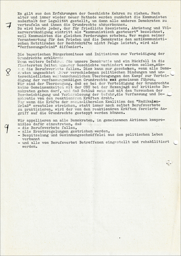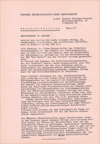 12 »Berufsverbote«, Nachlaß Zingerl, Archiv der Münchner Arbeiterbewegung