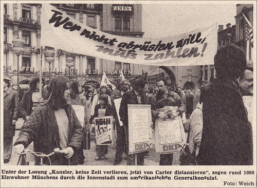 che Lösung der Geiselaffäre! 3. Sofortige Distanzierung von jeder Kriegsvorbereitung! Lasst es uns in diesem Sinne den Kriegsvorbereitern in Ost und West zeigen: Alle Menschen wollen Frieden, die Staaten rüsten. Runter von dem Pulverfass! Raus auf die Straße! Gegen den 3. Weltkrieg! – 21. – 23. Mai: Aktionstage am Marienplatz mit Infoständen, Musik etc. – 24. Mai: Demonstration, 10 Uhr Odeonsplatz über Stachus und Sendlingertor-Platz zum Marienplatz zur Abschlusskundge-